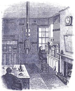 The Tonbridge Telegraph Office was the nerve centre of the telegraph network of the South-Eastern Railway, and had been set up by the go-ahead electrical engineer Charles Walker, who lived in the town. Dickens wrote a description of the room, pictured below, with its instruments for sending and receiving messages looking like ‘the fronts of little mahogany churches with big clocks’.