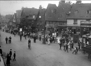 Trouble broke out when members of the National Union of Women’s Suffrage Societies (NUWSS) held meetings in Tonbridge on 21st July 1913. One of the speakers ‘greatly aroused the indignation of a great number of the male portion of the crowd’. The lady concerned became ‘the subject of considerable hustling all along the High Street’, and police protection had to be called, according to the local paper, The Tonbridge Free Press which is available on microfilm in Tonbridge Reference Library.)