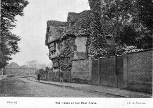 A short distance up this turning will be found a most interesting relic of the past in the Old Ivy House [now renamed Port Reeve’s House], an illustration of which we include in this book. This picturesque old landmark was formerly the house of the Port Reeve, where in olden times owners of cattle coming into the town were taxed. The building is known to be over 450 years old, and an examination of its oaken beams shows it to be as good as ever, and perchance it may yet last for many more years. It now consists of three cottages, the building facing the road being once known as the Old Swan Inn. The diminutive character of its doorways cause the reflection that although “our fathers were high-minded men,” they must have been exceedingly low of stature. Silk hats, beware!
