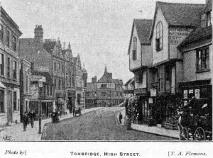 The extract below is from the book Tonbridge for the Resident, the Holiday Maker and the Angler, by W. Stanley Martin and B. Prescott Row (price sixpence), written in 1896. At that time there was much building going on in the town in connection with the widening of the High Street. Over a period of years every building on the west side of the High Street from the south end up to the Big Bridge was demolished and rebuilt further back.