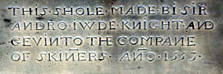 THREE WYVES HE HAD ONE WAS MARY / FOWER SUNES ONE MAYDE HAD HE BY HER / ANNYS HAD NONE BY HIM TRVLY / BY DAME MARY HAD ONE DOWGHTER / THVS IN THE MONTH OF SEPTEMBER / A THOWSANDE FYVE HVNDRED FYFTEY / AND EYGHT, DIED THIS WORTHIE STAPLAR / WORSHIPYNGE HIS POSTERYTYE