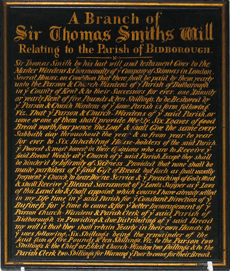 Rumoured to have fallen victim of the plague which, according to the historian Hasted, ‘raged greatly here at that time’, Sir Thomas Smythe died at Sutton Place, Sutton at Hone, in 1625. His Will was proved in the Prerogative Court of Canterbury in 1625. It was very carefully and responsibly crafted, giving us a glimpse of his generous nature with a hint of humour and sentimentality. He bequeathed to the Skinners’ Company all his houses, messuages, land and tenements near Paul’s Gate at the west end of Watling Street, as well as his messuage and tenements in Lyme Street. They were to be held for charitable purposes: for the distribution of bread and cloth to the poor of the Parishes of Bidborough, Tonbridge, Speldhurst, Sutton at Hone and Darenth; a yearly sum of Ten Pounds to the Master of the Free Grammar School [Tonbridge School] and five to the Usher, and six exhibitions of £10 each to ‘youthes to be chosen who should prove themselves most capable’ and whose parents could not maintain them at the university for the study principally of divinity.