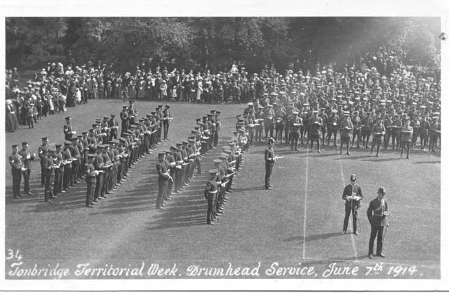 Tonbridge at War 47 Pictures from the THS Pictorial records collection with the catalogue reference. Click < or > to go forward or backword to see each image or click on the image. ©Tonbridge Historical Society, 2023 22.053 Image 29 of 47 (22.053) Tonbridge Territorial Week, Drumhead Service, 7th June 1914