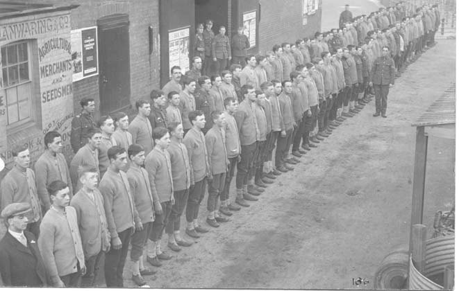 Tonbridge at War 47 Pictures from the THS Pictorial records collection with the catalogue reference. Click < or > to go forward or backword to see each image or click on the image. ©Tonbridge Historical Society, 2023 22.060 Image 32 of 47 (22.060) Recruits at the Royal West Kent Drill Hall (formerly Corn Exchange) in Tonbridge Market, probably August 1914