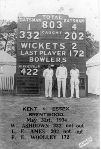 Three of Tonbridge’s finest players are profiled below, but there have been many others almost equally deserving of mention: Doug Wright, ‘Hopper’ Levett, Alan Watt, Tich Freeman, Leslie Ames, and Arthur Fagg. The last of these, on leaving Sussex Road School, soon established a place in the Kent side as an opening bat and followed this by playing for England. He remains to this day the only first class player to score a double century in each innings of a match, something he achieved playing for Kent against Essex at Colchester in 1938.
